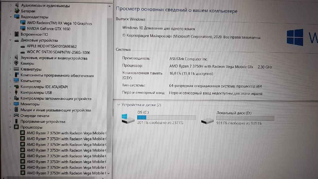 ЖЕСТКИЙ ДИСК - HDD 1000Gb + SSD 256Gb (ТВЕРДОТЕЛЬНЫЙ НАКОПИТЕЛЬ. НА НЕМ УСТАНОВЛЕНА WIN10)